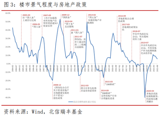 如图3所示,商品房销售面积累计同比,也即楼市的景气程度与房地产政策之间存在着明显的相关关系。当楼市升温时,房地产政策往往趋紧,而当楼市进入下行周期时,房地产政策则开始放松。