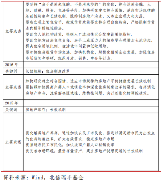首先是在2016年12月14日至16日在北京举行的中央经济工作会议上提出了“促进房地产市场平稳健康发展。要坚持‘房子是用来住的、不是用来炒的’的定位,综合运用金融、土地、财税、投资、立法等手段,加快研究建立符合国情、适应市场规律的基础性制度和长效机制”。这是政府首次提出“房住不炒”的概念,政府在此后的房地产调控中也一直坚持这一路线。2017年3月17日,北京市住房和城乡建设委员会、北京住房公积金管理中心等五部门联合印发了《关于完善商品住房销售和差别化信贷政策的通知》,此次不仅上调首付比例,而且“认房又认贷”的房地产调控政策,在当时被称为北京史上最严调控政策。在北京的317调控新政出台几天内,石家庄、郑州、广州、长沙、保定等地也纷纷跟进,加码出台了各自的住宅限购限贷政策。2017年12月18日至20日在北京举行的中央经济工作会议则提出“加快建立多主体供应、多渠道保障、租购并举的住房制度。完善促进房地产市场平稳健康发展的长效机制,保持房地产市场调控政策连续性和稳定性,分清中央和地方事权,实行差别化调控”。
