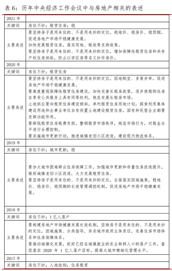 在7年的中央经济工作会议房地产相关表述的关键词中,“房住不炒”出现了5次,“长效机制”、“租赁住房”同样是多次出现的高频词汇。通过梳理历年“房住不炒”相关政策的表述与高频词汇,我们可以大致梳理出“房住不炒”的政策实现路径。从短期措施来看,“房住不炒”主要通过限购政策、房贷利率的调整来控制投机性需求的扩张。同时,政府还通过集中供地、房企“三道红线”等手段来限制房企的高杠杆、高负债的扩张道路,防范相关金融风险。就长效机制而言,一方面,政府注重保持政策的稳定性、连续性,以达到稳地价、稳房价、稳预期的目的,防范房价大幅波动带来的金融风险。