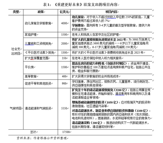 第一,《重建更好未来》法案大力支持新能源领域,有助于应对气候变化,刺激经济复苏。根据法案,5550亿美元将用于新能源行业,重点支持太阳能、风能和其他关键行业以促进美国国内供应链发展,并将通过赠款、贷款、税收抵免和采购等方式推动对美国制造业脱碳和振兴的资本投资(表1)。光伏风电方面,提升税收减免比例,并延长投资税收抵免时限。将美国光伏产业税收减免比例由26%提升至30%,减免时间从2022年延长至2026年。储能方面,首次获得单独的税收减免。在2026年前,实现对高于5KWh的储能系统最高30%的退税。新能源汽车方面,将税收抵免优惠由7500美元提升至最高1.25万美元。对于新能源领域的投资,有助于美国经济由化石燃料向清洁能源转型,提高企业及工人的生产率,促使整个经济体具备生产更多商品和服务的能力,强化供应链韧性。