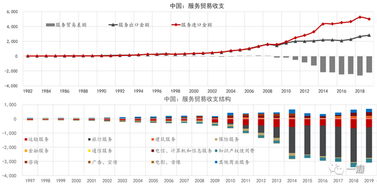 是否拥有比较优势,可是从贸易收支做判断。中国是世界出口第一大国,却是服务贸易弱势国家,服务占出口的比重不足10%,远低于世界平均水平和西方国家。加入WTO以来,中国虽然一直保持贸易顺差,但服务贸易却多处于逆差状态(图3)。其中,旅行服务、运输和知识产权使用费和保险是逆差的主要来源。反观美国,上世纪80年代末以来,虽然一直是贸易逆差,但服务贸易却始终保持顺差,与中国的双边贸易也是如此。