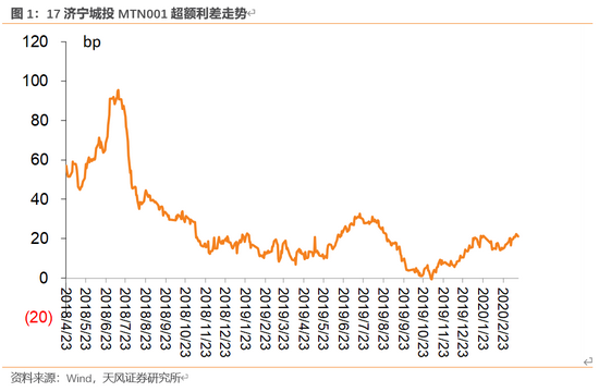 二级市场方面,我们以17济宁城投MTN001为代表券,利用差值法计算该券中债估值收益率与中债同评级同期限中短期票据到期收益率的差,得到超额利差。我们发现超额利差存在一定波动,尤其2020年2月以来,在城投债超额利差收敛的背景下,代表券超额利差有所上升,这样的波动或与如意科技债务情况有较大关系。