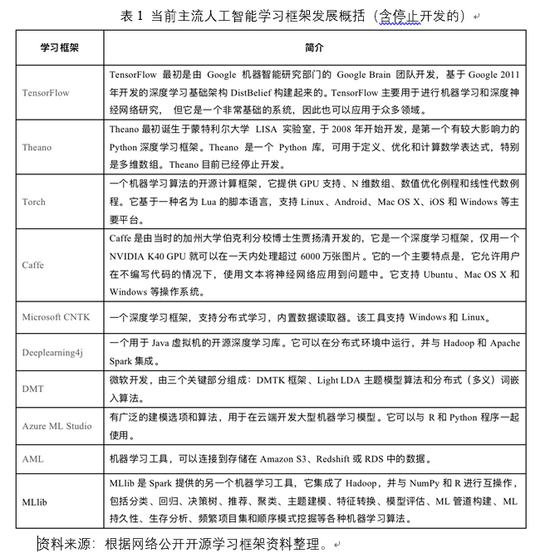 当前主流人工智能学习框架依然主要是美国的,这一点中国仍需加强。如表1所示,当前主流的人工智能机器学习和深度学习框架基本来自美国谷歌、微软、亚马逊、Meta(脸书)等大公司,或者主要由在美国的人开源和发起开源维护工作。人工智能的学习框架是人工智能产业的“地基”。为了进一步加强中国人工智能产业“地基”的稳定性,我国相关行业企业以及相关的产学研机构仍然需要进一步努力,积极推进相关基础研发工作。