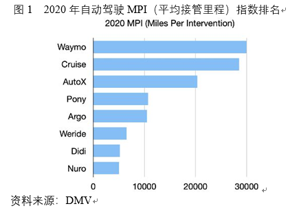 自动驾驶领域美国全球领先,但中国步步逼近。2021年2月10日,美国加州交通管理局DMV发布全新2020年全年自动驾驶数据(MPI)。如图1所示,谷歌旗下的Waymo、美国通用汽车旗下的Cruise分别排名前两名。福特旗下Argo名列第五。中国自动驾驶公司AutoX、小马智行(Pony)分别为第三名、第四名。中国文远知行(WeRide)位列第六名。第八名为美国自动驾驶科技公司Nuro。