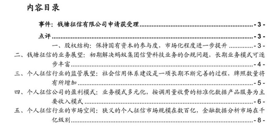 点评:1、股权结构:保持国有资本的参与度,市场化程度进一步提升。钱塘征信的股东中,浙旅投集团与蚂蚁集团的持股比例均为35%,并列第一大股东;股东均为浙江省内公司,具有地方性征信公司的特征。2、钱塘征信的业务展望:初期解决蚂蚁集团信贷科技业务的合规问题,长期业务模式可逐步丰富。设立个人征信公司是蚂蚁集团整改内容的组成部分之一,蚂蚁集团将通过个人征信公司向金融机构提供征信服务。征信数据的维度有望增加,引入蚂蚁集团的数据源,征信数据的采集、处理及使用要符合《征信业务管理办法》的要求,遵循最小、必要的原则。产品角度,先从基础信用信息和信用评分产品入手,逐步丰富产品线,并拓展小微金融的征信业务。3、征信行业的监管展望:社会信用体系建设是一项长期不断完善的过程,牌照数量将有所增加。个人征信相关的法律制度和业务规则有待进一步完善和细化,涉及多个监管部门。个人征信行业仍处于发展早期,牌照数量有望继续增加。助贷机构本质上也提供了征信服务,监管要求有待进一步明确。 4、个人征信公司的盈利模式:业务模式多元化,按调用量收费的标准化数据产品服务为主要收入模式。以服务金融机构为主,提供信用报告及信用评分调用;个人征信具有公共基础设施的属性,预计基本模块的费率设定会比较低;征信公司具有明显的规模效应,长期来看,少数头部公司会占据主要市场份额。5、个人征信行业的市场空间:狭义的个人征信市场规模在数百亿,金融数据分析市场在千亿级别。国内个人征信行业正处于0到1的高速成长期,个人征信公司在金融数据分析市场的市占率有望提升,头部征信公司的年收入规模有望达到百亿级别。