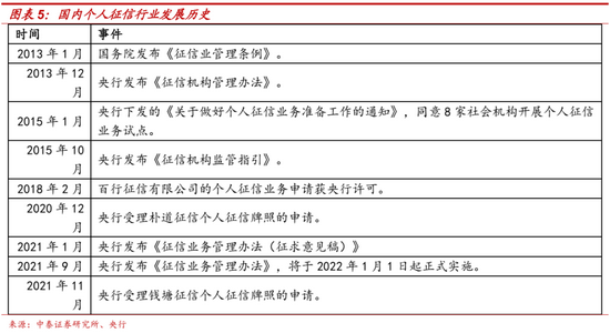 事件:2021年11月26日央行官网显示,中国人民银行受理了钱塘征信有限公司(筹)的个人征信业务申请,公示了公司的基本信息,包括注册地、注册资本及股东构成,其中蚂蚁集团占比35%。若申请通过,钱塘征信将成为第三家市场化个人征信牌照公司。