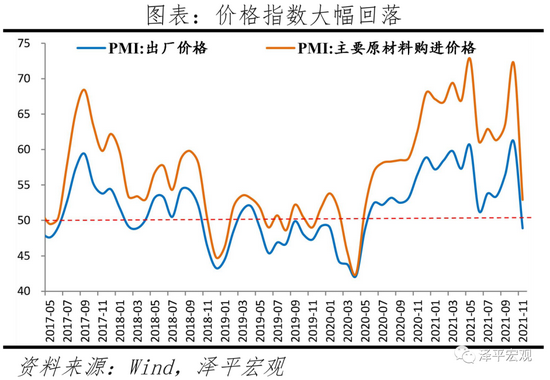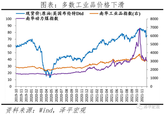 3)价格指数大幅回落,10月下旬以来保供稳价政策密集落地。11月主要原材料购进价格指数和出厂价格指数分别为52.9%和48.9%,回落19.2和12.2个百分点。11月南华工业品指数环比-13.8%,动力煤、焦煤、螺纹钢价格指数环比-39.2%、-33.2%和-17.1%。