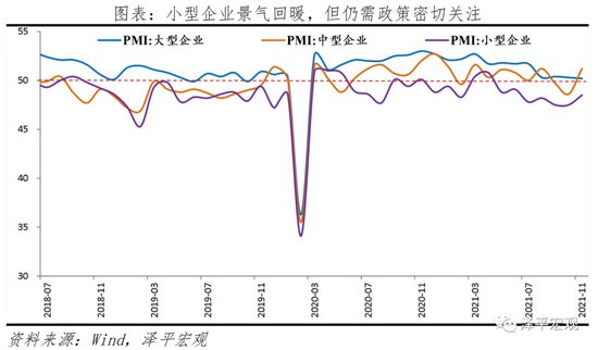 11月大、中、小型企业PMI分别为50.2%、51.2%和48.5%,较上月变动-0.1、2.6和1.0个百分点。小型企业经营指标有所修复,但压力仍在。小型企业新订单指数为47.6%,较上月回升1.5个百分点;新出口订单46.6%,回升5.3个百分点;小型企业经营预期为51.9%,回升2.5个百分点。