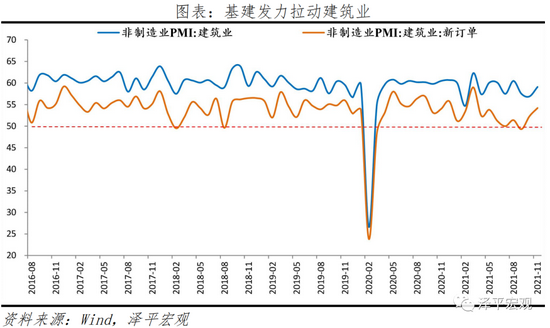 建筑业商务活动指数为59.1%,较上月反弹2.2个百分点。从市场需求和劳动力需求看,建筑业新订单指数和从业人员指数分别为54.2%和51.3%,较上月变动1.9和-1.1个百分点。从价格看,建筑业投入品价格指数、销售价格指数分别为44.9%和52.5%。从市场预期看,业务活动预期指数分别58.3%,低于上月2.0个百分点。基础设施建设进度有所加快。从行业情况看,土木工程建筑业商务活动指数和新订单指数分别为60.5%和56.5%,比上月上升5.4和0.5个百分点。