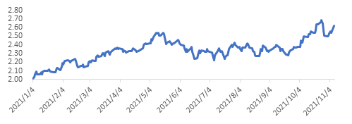 2021年二季度通胀已明显升温,但美联储没有采取加息乃至缩减QE等有力政策,而是以类似“窗口指导”的方式去侧面引导市场预期——鲍威尔一再公开表示“通胀是暂时的”。可能得益于近四十年来美联储在控制通胀方面积累的良好声誉,市场一度倾向于相信这一表态。以十年期盈亏平衡通货膨胀率[7]衡量的市场通胀预期在持续升高后,在2021年5月有所下跌,并保持相对稳定直到9月。但从9月中旬开始,盈亏平衡通货膨胀率再度急升,到10月底一度接近2.7%,大大超过了美联储2.0%的通胀率目标水平[8]。