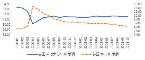 由于无法控制新冠肺炎疫情蔓延,美国只得采取“以拖待变”策略:通过财政、货币政策大放水拖住经济不崩溃,被动等待疫情出现转机。因此判断货币政策何时调整的关键,即在于判断疫情之“变”是否到来。2021年以来,美国一方面新增病例数居高不下,劳动力参与率稳定地低于疫情前水平;另一方面,居民对疫情重视程度明显降低,失业率大幅下降——这一复杂局面干扰了美联储的判断,迟滞了收紧货币政策的时间点,从而加剧了通胀。从疫苗接种量和劳动力参与率来看,美国疫情可能在2021年5月左右进入了新阶段并持续至今,这促使美联储终于在11月下定决心缩减量化宽松政策。未来,观察新增病例数、患病致死率、疫苗接种量等指标,可帮助判断美国是否还需“以拖待变”,从而判断货币政策走向。