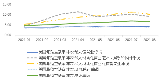 这显示出,美国的疫情之变可能已经来到,但美国疫情的新形势,既不同于疫情之初的百业凋零、供需两弱,也不同于中国的动态清零、有效复工,而是呈现出三个特征。第一,从总体来看对疫情的容忍度大大提升,不再视疫情为经济运行的严重阻碍,对那些愿意工作的人而言,失业问题正在明显改善。第二,尽管如此,仍有约500万人因疫情而不愿工作,即使失业补贴到期,回归工作岗位的意愿也不强。第三,从职位空缺率来看,建筑业、公务员等行业职位空缺率与疫情前相比已差距不大,但住宿餐饮业、艺术娱乐和休闲业的职位空缺率较疫情前大大升高,这反映了疫情仍对不同行业造成了结构性的冲击。