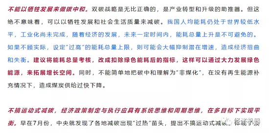 3)“要科学考核,新增可再生能源和原料用能不纳入能源消费总量控制,创造条件尽早实现能耗“双控”向碳排放总量和强度“双控”转变,加快形成减污降碳的激励约束机制,防止简单层层分解”。今年能耗双控中,没有把清洁能源从能耗中剔除,搞一刀切,是东南沿海发达省市强制断电的重要因素,而这种的方法显然是有悖于碳中和精神的,不利于激发清洁能源发展的积极性。本次会议中,把新能源剔除在能耗之中,无疑打开了经济发展的空间和新能源发展空间。我们之前文章中也曾反复呼吁,不以牺牲发展来搞碳中和,能耗双控考核应剔掉绿色能耗(下截图)。中央这次采纳,表明了实事求是、从善如流的精神。
