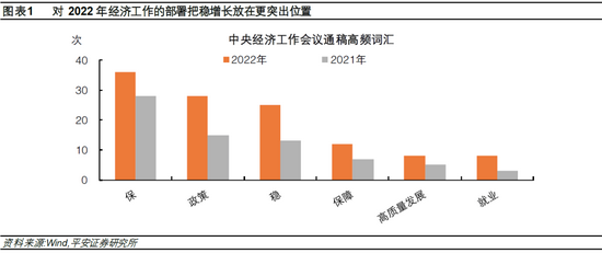 2021年12月8日至10日,中央经济工作会议在北京举行。会议强调,“明年将召开党的二十大,这是党和国家政治生活中的一件大事,要保持平稳健康的经济环境、国泰民安的社会环境、风清气正的政治环境”。围绕这一大局,中央经济工作会议对2022年的部署把稳定宏观经济放在了更突出的位置。会议新提出了“着力稳定宏观经济大盘”、“稳字当头、稳中求进”、“各方面要积极推出有利于经济稳定的政策,政策发力适当靠前”、“跨周期和逆周期宏观调控政策要有机结合”等要求。纵观会议通稿,提到36次“保”、28次“政策”、25次“稳”、12次“保障”,均较去年显著增加。