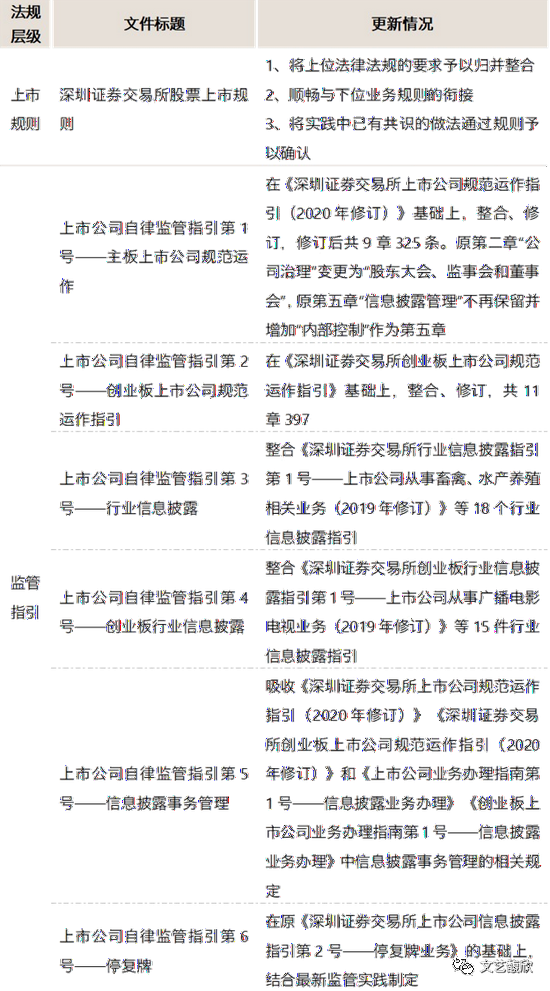 深市方面,深交所以修订股票上市规则为重点,一体推进自律监管指引、自律监管指南适应性修订,将整合后形成的规范运作、行业信息披露等13件自律监管指引按序编号;将业务办理类相关的原59件业务指南、指引分别整合形成主板、创业板业务办理指南。