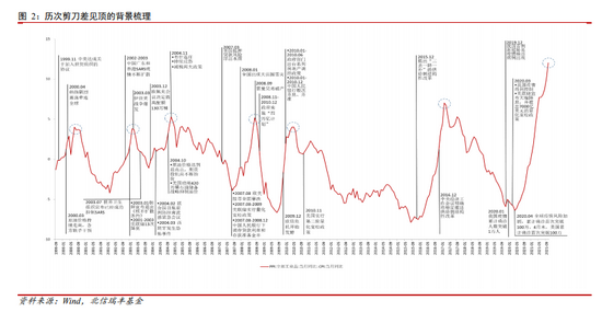 纵观我国近20年的剪刀差演变历史,明显的见顶周期共有六次:2000年7月、2003年2月、2004年11月、2008年8月、2010年5月以及2017年2月。
