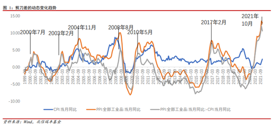 自1999年以来我国共出现七轮典型的PPI-CPI剪刀差见顶,分别出现在2000年7月、2003年2月、2004年11月、2008年8月、2010年5月、2017年3月和2021年10月(本轮剪刀差)。回顾历史数据,我国的PPI-CPI剪刀差基本上一直处于大幅波动的状态,1999-2011我国PPI、CPI基本保持同步波动,PPI与CPI的传导更为密切,此后,我国GDP与CPI波动幅度收窄,PPI的波动造成PPI-CPI剪刀差来回震荡,呈周期性变化。