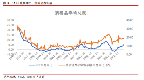 这一阶段国内消费水平状况并不乐观:一方面,1997年的亚洲金融危机余波尚在,直至2004年才彻底缓和;另一方面,2003年爆发的SARS疫情对我国居民生活影响较大,消费受到压制,因此CPI较为缓和,直至2003年末CPI才逐步恢复。