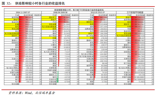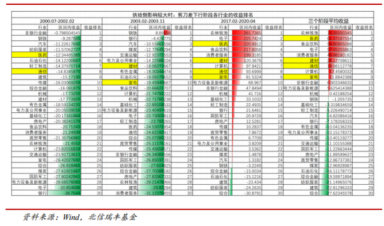 在行业方面,供给侧影响较大和较小的不同时期,剪刀差下行阶段各行业的收益排名分化明显。我们按照供给侧影响是否突出,将6次下行阶段分为两类:供给侧影响较大的类型(2000年7月-2002年2月、2003年2月-2003年11月、2017年2月-2020年4月),供给侧影响较小的类型(2004年11月-2007年7月、2008年8月-2009年8月、2010年5月-2015年7月),每一类各3个阶段。行业分析时,我们定义在3个阶段中至少有2个阶段排名前10,且三个阶段的平均收益也在前10的行业为相对高收益的行业。