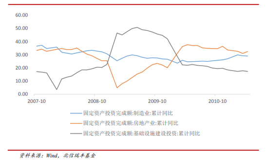 尽管从整体来看,次贷危机并未对我国固定资产投资产生明显影响,但将固定资产投资拆分后可明显看出,制造业和房地产开发在2008年均呈现明显下滑趋势,而基建投资在2008年3月前出现大幅度下滑之后不断上升,说明整体而言固定资产投资并未产生大幅度波动,主要是由于基建投资的拉动作用。