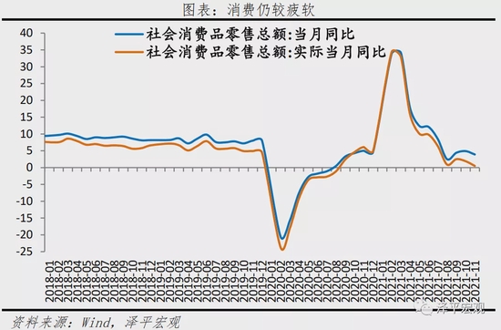 4、消费受疫情、就业、收入、复苏K型分化影响,仍疲软。11月社会消费品零售总额两年复合增长4.4%,较上月下降0.2个百分点;扣除价格因素,实际两年复合同比3.3%,较上月上升0.1个百分点。分品类看,必需消费品和升级类消费品表现强劲;石油制品类消费受能源价格上涨拉动;汽车仍造成拖累,除汽车以外的消费品两年复合同比5.4%。