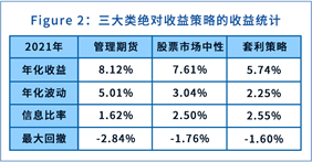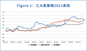 从走势上来看,三大类策略均有不错的表现,可以看到在2月份,股票中性和CTA策略都有所回撤的时候,套利策略表现较好,之后9月份开始随着股票市场波动率持续降低,套利策略的收益也渐渐走平。对CTA策略来说今年有两波行情,分别是5月份和10月份,而且都是商品期货多头趋势带来的收益。另一方面,股票对冲策略似乎平静许多,全年保持了较好的上升势头,只是在2021年4月和10月的股市低波动环境里有过回撤。