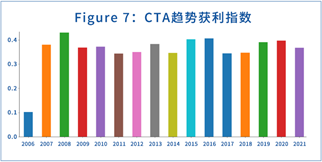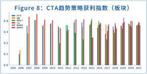 首先从Figure 7可以看到,今年的商品期货市场的趋势弱于2020,2019,强于2017,2018。这与我们的直观感受是相符的,今年尽管黑色系几经大起大落,但是放在历史长河中,对CTA策略的影响其实也不是最极端的一年。