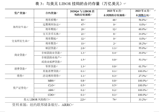 长期以来,LIBOR是国际金融市场上最广泛使用的基准利率,以其定价的金融合约规模巨大,遗留合同转换将成为重要的风险聚集点。从规模看,在2023年6月30日LIBOR完全退出之后,美元LIBOR风险敞口仍高达74万亿美元。从结构看,未到期合约中91.9%为利率互换、利率期权等衍生品合约,且大部分消费贷款、证券化产品(如MBS)也在未到期之列(表3)。