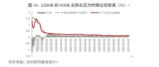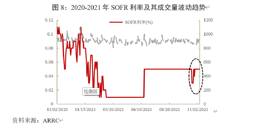 当前,美国CPI持续高位运行,美联储已开启缩减购债(Taper),导致市场加息预期升温。面对预期变化,收益率曲线前端(短期国债收益率)定价发生错位,引发对冲基金大举做空基差,即通过回购市场借入国债并在现券市场卖出,同时在期货市场建立多头头寸。对冲基金通过开展基差交易,在美国国债现券价格和期货价格之间进行套利,并导致SOFR利率异常下行(图8),由此引发以其定价的产品价值波动性上升。
