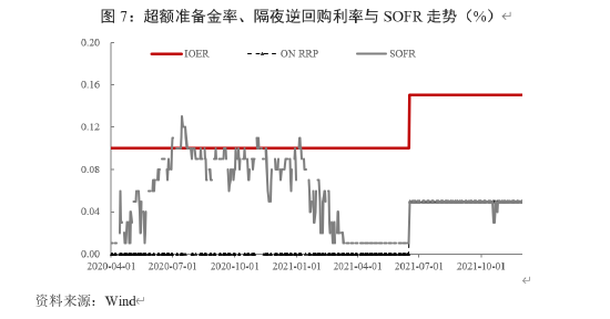 SOFR是以国债为抵押的隔夜融资利率,不仅反映融资市场的资金供求状况,还反映作为抵押品的国债供求状况。当国债需求增加而供给不足时,资金供给方愿以极低的价格贷出资金获取国债,SOFR利率走低;当对国债需求较低且供给充足时,资金供给方则提高对投资者的隔夜融资利率,SOFR利率攀升。因此,财政部通过调整国债供给状况,能够间接影响SOFR走势。当前,美国财政部国库券供给不断下降,与2020年12月相比,国库券净发行规模下降了11780亿美元。与此同时,美联储仍未全部退出资产购买计划,导致市场对“安全资产”国债的需求旺盛,并引发“安全资产荒”。此时,资金供给方愿以极低的价格向市场贷出资金而获取国库券,促使SOFR处于利率走廊的底部(图7)。