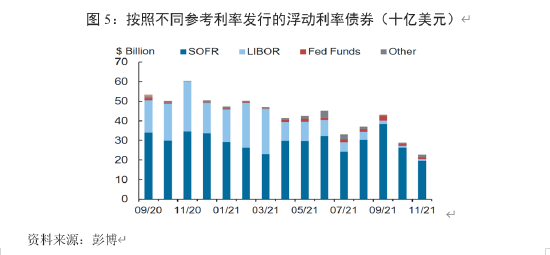 从债券产品看,90%以上浮动利率债券发行已经完全参考SOFR利率,累计已发行约12000亿美元。截至2021年10月,未偿付的名义浮动利率债券规模约为4000亿美元(图5)。与消费产品相关的资产证券化也持续取得进展。2021年以来,美国政府支持的金融机构(GSE)只接受基于SOFR的浮动利率抵押贷款,促使房利美和房地美与SOFR挂钩的MBS发行量显著增长,截至2021年11月,与SOFR挂钩的MBS规模已达900亿美元。