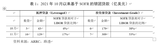 从商业贷款看,SOFR贷款推广相对缓慢。2021年以来,多数银行开始提供基于芝加哥商品交易所(CME)制定的1个月、3个月和6个月期限利率的定期SOFR贷款产品,并且还提供基于SOFR平均值和后置SOFR的多种贷款产品,促使SOFR贷款规模开始缓慢增长(表1)。例如,福特在9月份签订了一份150亿美元的后置SOFR贷款。