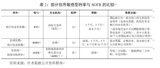 虽然SOFR提供了稳健可靠的无风险利率,但由于缺乏反映信用风险的成分,并不能满足所有细分市场的需求,非政府部门纷纷运用商业票据(CP)和大额存单(CD)无抵押融资市场交易来构建曲线,通过纳入信贷利差并定义期限结构,以加强版的方式重现LIBOR。例如,ICE建立了无担保银行收益指数(Bank Yield Index,BYI);彭博发布短期银行收益率指数(Bloomberg Short-Term Bank Yield Index,BSBY)[7](表2)。美国芝加哥期权交易所与美国金融交易所(AFX)联合推出30天、90天的Ameribor Term Rate[8]。IHS Markit于2021年6月1日开始发布前瞻性的信贷敏感利率CRITR(Credit Inclusive Term Rate)和CRITS(Credit Inclusive Term Spread)。