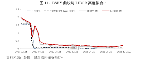 LIBOR作为银行间同业拆借利率,理论上可以分解为三个部分:一是无风险利率。反映总体利率水平。二是信用风险溢价。衡量了LIBOR报价行的违约风险。三是期限溢价。衡量市场对于期限所做出的风险补偿。SOFR本质上为无风险利率(Risk-Free Rate,RFR),缺乏信用风险溢价和期限溢价。