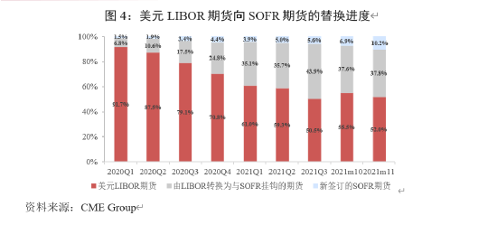从场内衍生品看,SOFR期货量增长快速。从2020年第一季度到2021年11月,美国SOFR期货合约规模占比由8.3%增至48.0%,增幅达39.7%。其中,美元LIBOR期货转换为SOFR期货的比例由6.8%上升为37.8%,增长了31个百分点。新签订的SOFR期货占比则由1.5%增长至10.2%(图4)。