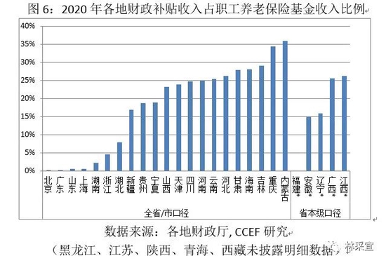 2020年,全国职工养老基金的财政补贴收入总计6271.3亿元,其中披露全省/市口径数据的 21 个地区财政补贴收入占当期职工养老保险基金收入比重的中位数水平约在 23.3%,北京、广东、上海和山东对补贴的依赖程度最低,占比均未超过1%[1]。而内蒙古、重庆、吉林等省份对财政补贴的依赖性最高(图6)。
