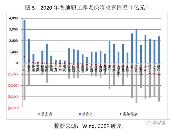 2020年,我国31个省、市、自治区中仅广东(544.5亿)、北京(204.7亿)、云南(15.3亿)、西藏(13.9亿)、新疆(4.2亿)和湖南(2.4亿)6地的职工养老保险基金收支有盈余,其他地区都是入不敷出。
