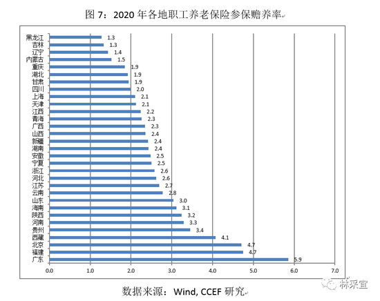 另一方面,从参保人群的结构看,各地职工养老保险的可持续性同样不容乐观。目前共8个地区参保赡养率[2]低于2,在黑龙江、吉林等地接近1,这意味着每个在职职工平均都将承担一位退休老人的实质赡养责任,这种赡养压力将随社会老龄化的日益严重而持续增大。