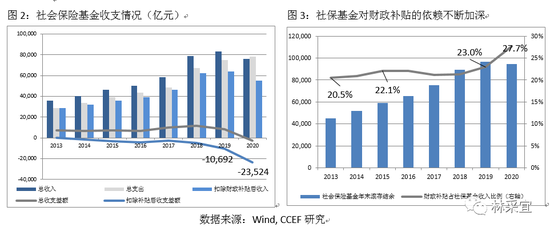 自从2013年开始,社保基金就已出现收支不相抵的情况,之后赤字规模逐年扩大,2019年,收支缺口1.07万亿,2020年受疫情影响,扩大到2.35万亿。从2013至2020年,社保基金累计结余的规模总计增长110.6%,同期财政补贴规模增长185.1%,社保基金对于财政补贴的依赖程度不断提高,目前财政补贴占社保基金总收入的比例为27.7%,比2013年上升7.2个百分点。