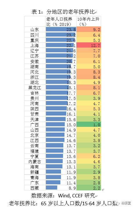 从区域数据来看,山东、四川、重庆、上海、辽宁、江苏及安徽是我国老龄化程度最严重的地区,当前老年人口抚养比均超过20%。从增长率来看,最近十年老年人口抚养比上升最快的城市为地区为上海、山东、浙江、河北和黑龙江,升幅都超过了8个百分点。