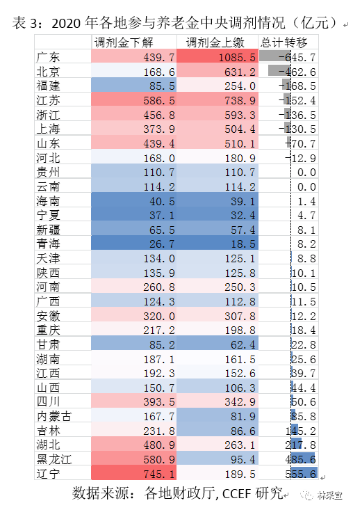 2018年,职工养老保险基金引入中央调剂制度。从2020年的地区转移变化看,中央调剂制度部分缓解了部分地区入不敷出的窘境,但从发展趋势来看,上海、山东、河北在人口老龄化的压力下继续援助外地省市的能力缺乏可持续性,福建、江苏和浙江的养老保障基金财力也趋于萎缩,可见职工养老保险基金的区域调剂不是长久之计。