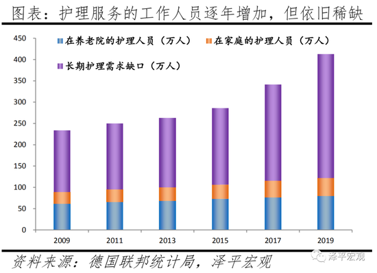 随着老龄化程度加深,德国依赖护理的老年人群尤其是婴儿潮一代需要护理的比例将显著增加,这对德国政府和私人护理机构来说是巨大的挑战。据德国联邦统计局数据,2019年12月,德国有413万人需要《长期护理保险法》所定义的长期护理,与2017年12月份需要长期护理的341万人相比,人数显著增加了71万人,上涨了21%。随着新的、更广泛的长期护理概念被人们所熟知,叠加老龄化加深,需要护理的人数会逐年增加。从参与护理的工作人员数看,德国2017年在养老院的护理员工为76.4万,在家庭护理中的护理员人数为39万,合计115.5万人,远低于当年需要护理服务的341万人。从居住地附近的康养设施、医疗机构分布看,2019年德国有大约67%需要护理的人生活在家庭环境中,并由亲戚或提供门诊护理服务的专业人员一起照顾。但根据柏林人口研究院统计,德国婴儿潮一代的76%以上的老人更希望更长时间的保持独立,并自由地在居住地附近活动,而不是单纯的在家中受到照顾。同时,35%的社区老人认为:在步行或承载交通工具短距离出行范围内,有完善的家庭医生、医疗用品商店的重要性就越来越高。尤其是在德国东部以及农村地区,医疗分支机构、保健中心的分布密度不足西部发达区域的60%,专业的护理人员短缺的现象也会随着老龄化加剧而越发严重。