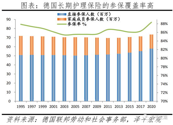 德国通过医疗健康保险和长期护理保险(SLTCI)两个系统提供全民保险覆盖,法定健康保险对个人是强制性的,长期护理保险则对已参加医保的人群自动覆盖。德国医保覆盖了超99%的人口,1995年SLTCI的参保率也达到了88.03%。德国通过法定健康保险 (SHI) 和私人健康保险 (PHI)两个系统提供全民健康保险,法定健康保险强制个人参保,除非个人收入超过60,750欧元,这允许他们选择私人保险。大约 88% 的人口通过疾病基金获得初级保险,11% 通过私人保险获得。从功能上看,法定医疗保险提供的医疗福利包括作为病房病人的住院(医院)护理,由注册医生提供的门诊护理和基本牙科护理,还可以在其成员因病无法工作期间支付病假津贴;长期护理保险则主要满足个人护理需求的部分费用,例如严重残疾者的喂养和洗澡等。从制度的覆盖面看,德国SLTCI尽可能地覆盖全体居民,尤其是纳入高收入的私人医疗保险的参保人。长期护理保险对已参加医保的人群自动覆盖,参保者的配偶和儿童也自动覆盖;私人医疗保险的参保人必须购买私人长期护理保险(PLTCI),或自愿注册参加SLTCI。1995年制度建立开始,SLTCI的参保率就达到了88.03%,其中29.19%的人是以家庭联保的方式进入长期护理保险制度,此后的参保率均在85%上下浮动。从财源看,法定医疗保险的资金来自雇员和雇主平均分配的 14.6% 的工资缴款。法定长期护理保险由雇员和雇主平均分摊的 3.05% 的工资提供资金。