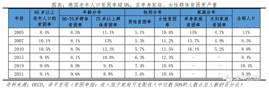 德国人口老龄化过程中的老年女性比重较高、未来单身家庭比例上升,使高龄老年人群体更容易陷入贫困。2005-2020年间德国65岁以上老年人贫困率由8.4%上升至9.1%。从老年人收入看,退休期收入减少使高龄老年人更容易陷入贫困。20世纪80年代中期,德国65岁以上老年人平均收入相当于全部人口平均收入的82.5%,而75岁以上老年人平均收入仅相当于全部人口平均收入的78.5%。因为受教育水平差异、就业不平等等原因导致女性收入较低,有时她们因为生儿育女和照顾家庭还不得不中断或停止工作,所以在以薪酬为基础的养老保险体系中,老年女性比老年男性更容易陷入贫困。在许多OECD国家中,由于就业歧视、退休年龄低、寿命较高 (个别女性因此成为寡妇)等原因,导致老年女性贫困率比男性平均高10个百分点。根据OECD定义的贫困标准,如果一个人的收入水平低于家庭人均可支配收入平均值的50%,那么就表明其处于贫困状态。OECD数据显示2021年德国75岁以上老年人贫困率为8.8%,65岁以上老年人贫困率为9.1%;老年女性贫困率为10.4%,显著高于老年男性7.6%的贫困率;根据2005-2010数据,老年单身家庭贫困率明显高于有配偶的老年家庭。人口老龄化特别是高龄化及老年女性比重较高,不仅需要德国政府未来考虑养老金给付时间延长的问题,还需要考虑该群体的基本生活保障等问题,从制度层面解决他们退休期的收入保障,确保他们的生活水准并有效避免老年贫困。