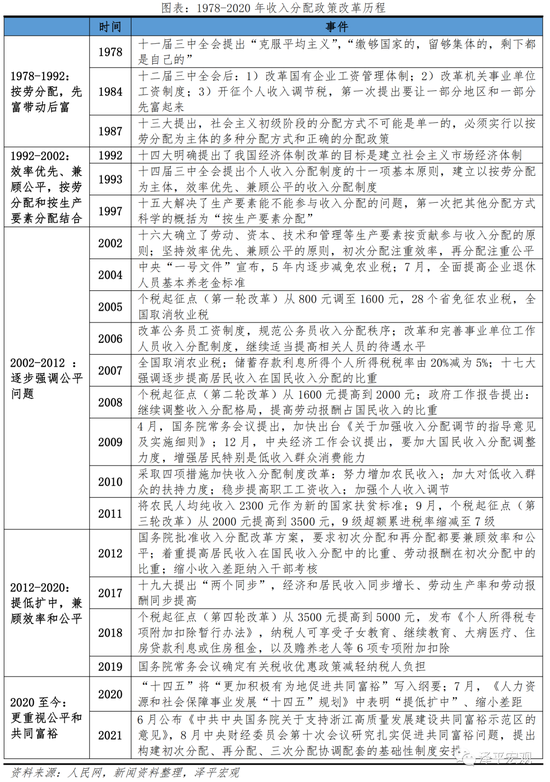 回顾我国经济改革历程,大致分为6个阶段:1)1949-1978年,“平均主义”,收入差距处于较低水平,但是效率低下、分配平均但不公平、缺乏激励。2)1978-1992年,“按劳分配”,农村实行“家庭联产承包责任制”,提高经济效率的同时,农村内部收入差距也率先扩大。3)1992-2002年,效率优先、兼顾公平,社会主义市场经济确立,企业转制,在经济高速增长的态势,城市内贫富差距快速扩大;户籍制度与土地改革制度促使资源进一步向城镇集聚,城乡间的贫富差距迅速扩大。4)2002-2012年,逐步强调公平,农村社保体制、城乡社会救济制度不断完善,贫富差距趋于缓和,同时受益于全球化红利和人口红利,经济高速增长;5)2012-2019年,提低、扩中,兼顾效率和公平,在就业、社保、扶贫攻坚等方面实施了一系列积极举措,贫富差距有所改善。6)2020年至今,更重视公平和共同富裕。