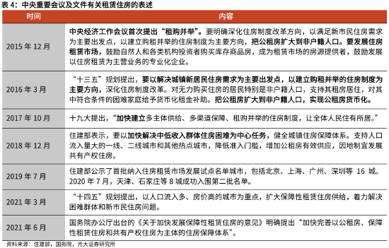 “十四五”期间,我国将扩大保障性租赁住房作为重点任务。“十四五”规划提出,以人口流入多、房价高的城市为重点,扩大保障性租赁住房供给,着力解决困难群体和新市民住房问题。2021年6月,国务院办公厅出台的《关于加快发展保障性租赁住房的意见》明确提出“加快完善以公租房、保障性租赁住房和共有产权住房为主体的住房保障体系”。