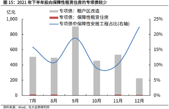 目前来看,2021年专项债用于保障性安居工程的,主要以棚改为主,用于保障性租赁住房的规模不足1%。若假设2022年发行3.5万亿新增专项债,并且2022年投向保障性租赁住房的占比提高到3%,则对保障性租赁住房的资金支持可达到1000亿元。