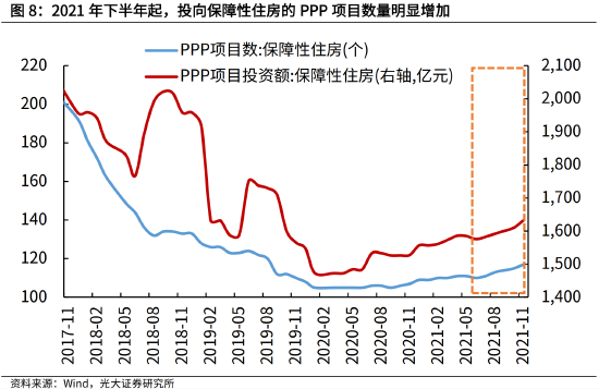 从项目进度看,2021年下半年以来,投向保障性住房的PPP项目开始提速。从资金来源看,中央早在2021年10月末就提前下达2022年的保障性安居工程财政补助资金,较上年提前2个月。2021年10月29日,中央提前下达部分2022年中央财政城镇保障性安居工程补助资金526亿元,较2021年提前2个月,专项用于城市棚户区改造,向符合条件的在市场租赁住房的保障家庭发放租赁补贴,城镇老旧小区改造,以及第二批中央财政支持住房租赁市场发展试点。