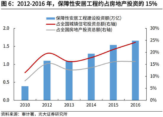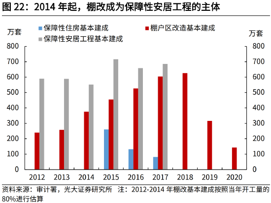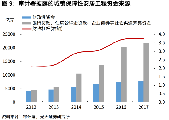 2012-2017年,保障性安居工程资金来源中,财政资金占比介于27%-47%,对应的财政杠杆介于2.1-3.8。根据审计署披露,2012-2017年间,城镇保障性安居工程资金投入从不足9000亿元,持续增加至近3万亿元。其中,银行贷款等社会渠道筹集资金占比从53%升高至73%,对应的财政杠杆从2.1升高至3.8。财政杠杆提高,与2014年以后,国家通过创设PSL等方式,加大对棚改的资金支持有关。
