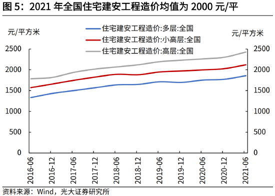 严格来看,每套保障性租赁住房的投资额,包括土地购置和建安支出。参考100城土地成交价格,假设全国住宅用地楼面均价为6000元/平。由于政策性扶持等原因,多数城市租赁用地价格均大幅低于住宅用地,我们假设租赁用地的出让价格为6000*15%=900元/平,住宅建安工程造价为2000元/平,假设每套面积为70平(参照保障性租赁住房建设标准,以建筑面积不超过70平方米的小户型为主),则每套保障性租赁住房的投资额为900*70+2000*70=20.3万元。